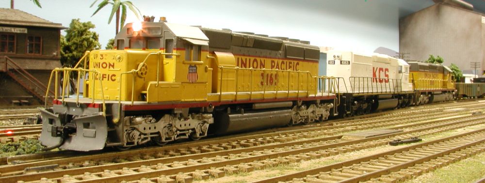 Having departed Yermo at the start of the session, UP Extra 3165W, the YRLA arrives in the San Bernardino A Yard to set-out cars. The train will then continue West to East LA with the remaining Pig Flats. Note the KCS power in the train. Most road trains on the CSW originate in either the East or West Staging Yards and terminate in the opposite staging yard. Then later the train will return as another train traveling in the opposite direction, thus the YRLA will return later as the LAYR with the same engine number. I refer to this as “Regenerative Staging”.