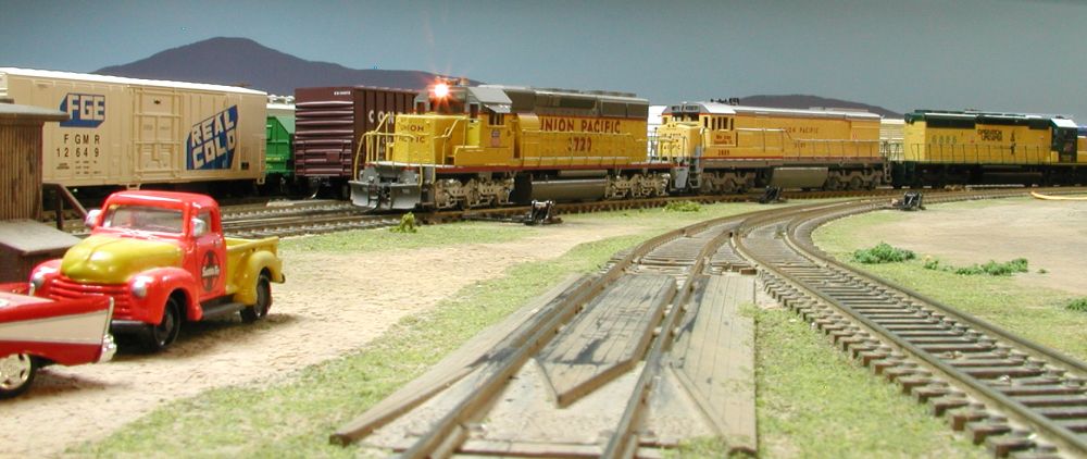 UP Extra 3720, the CLS has just descended Cajon Pass and has pulled into the B Yard where it will pick-up the First May cars. The train will then continue West to Colton, set-out cars to the SP, then continue West to set-out the May cars at Casa Blanca. On the left, we see that Track Inspector Otto Gage’s Hi Rail pickup is parked by the B Yard office.