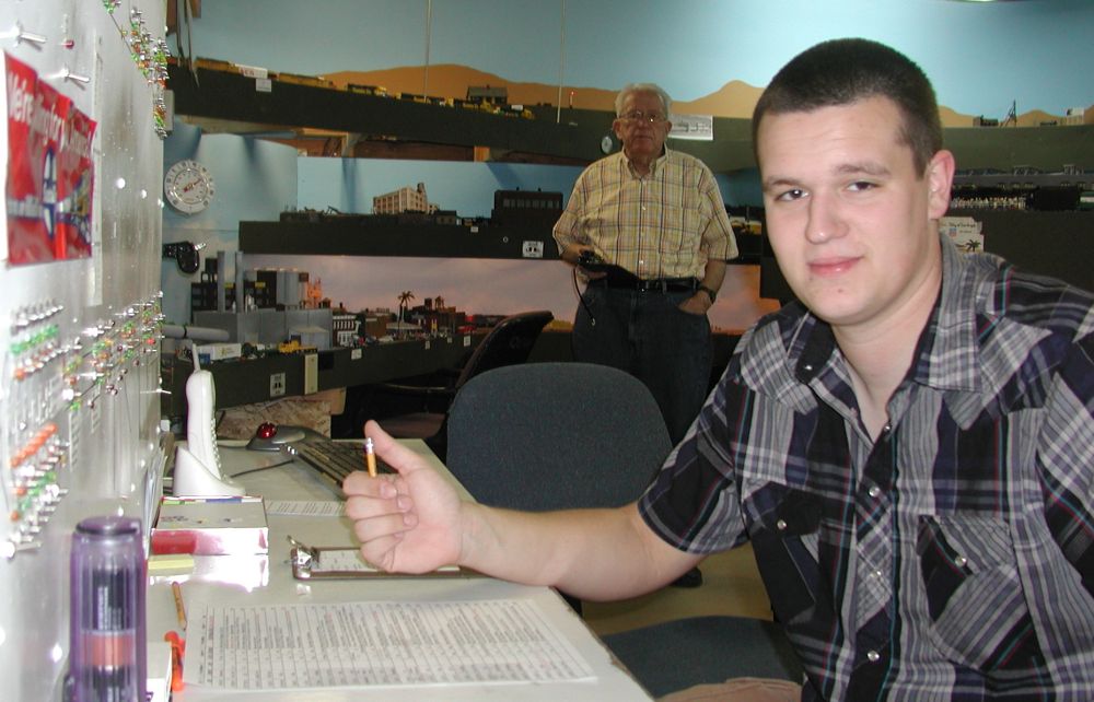 Dispatcher Patrick Palmersheim contemplates setting up the next meet. All main Line train movements on the CSW are controlled by the Dispatcher. Once in the yards, the train crews are under the control of the Yard Masters.