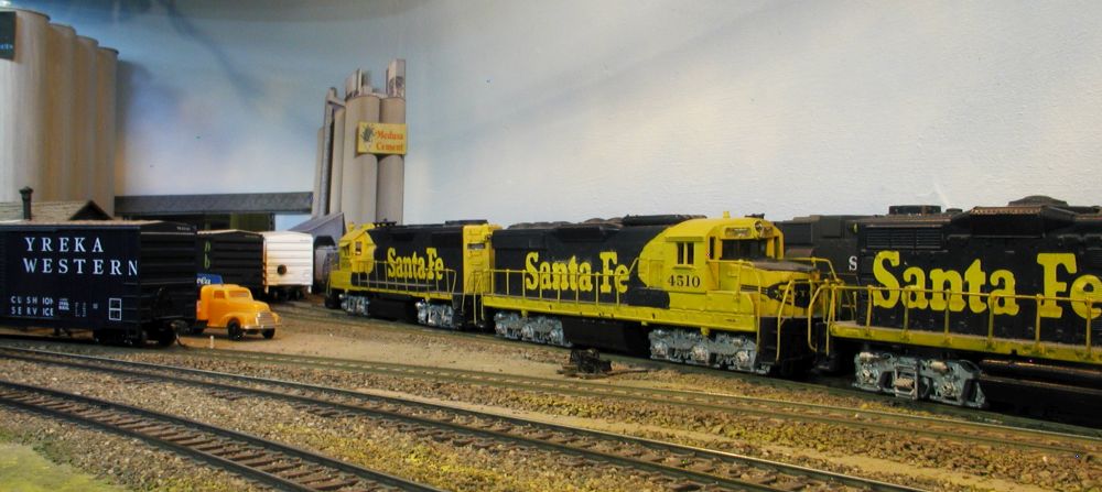 Extra 5204W, the 118 has just arrived in the San Bernardino B Yard where it will set-out most of it’s cars, then pick-up a cut of cars for the San Jac. Branch. We see Otto Gage’s Hi Rail pickup has pulled onto the clear for the 5204. On the far left is Igor’s red 57 Chevy.