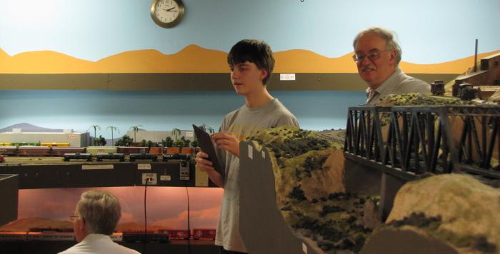 A young visitor is operating a train under the watchful eye of seasoned crew member Roy Foster. The CSW encourages young folks to operate trains.
