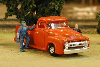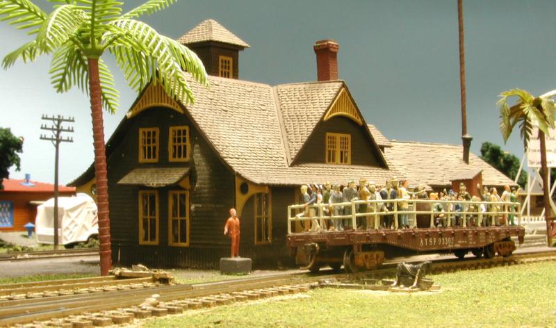 The Party Car with the “Inspection Crew” is waiting at the depot to be picked up for the return trip to Barstow. In the center of the picture we see the statue honoring the Prez.