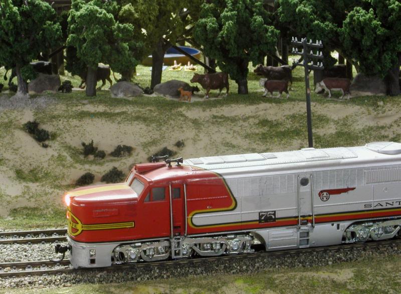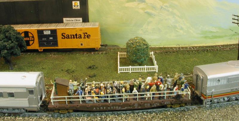 Over the two days of the CSWRR Open House numerous trips were made between Hobart and Barstow. Shown above we see the 75 easing its train down grade through Devore. In the background we see cattle grazing and through the trees we see sunbathers by the pool at the Nature Lovers Resort.